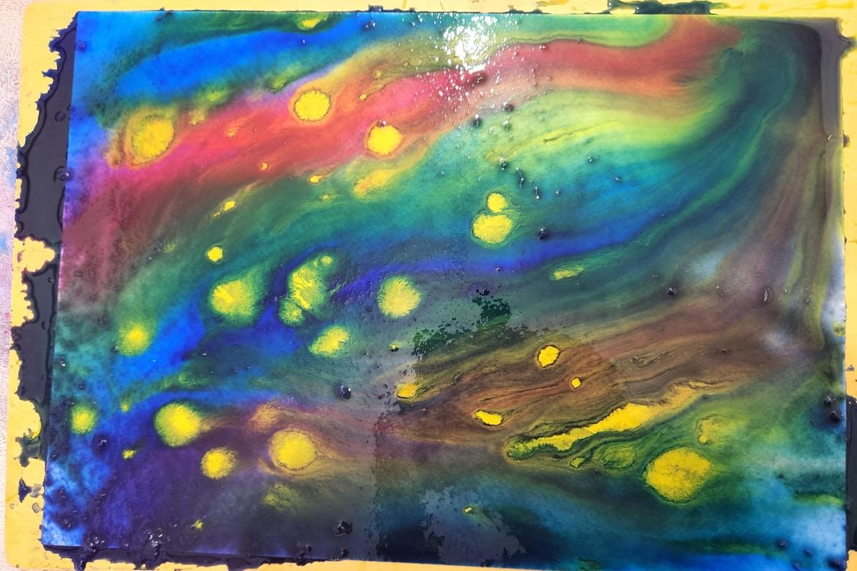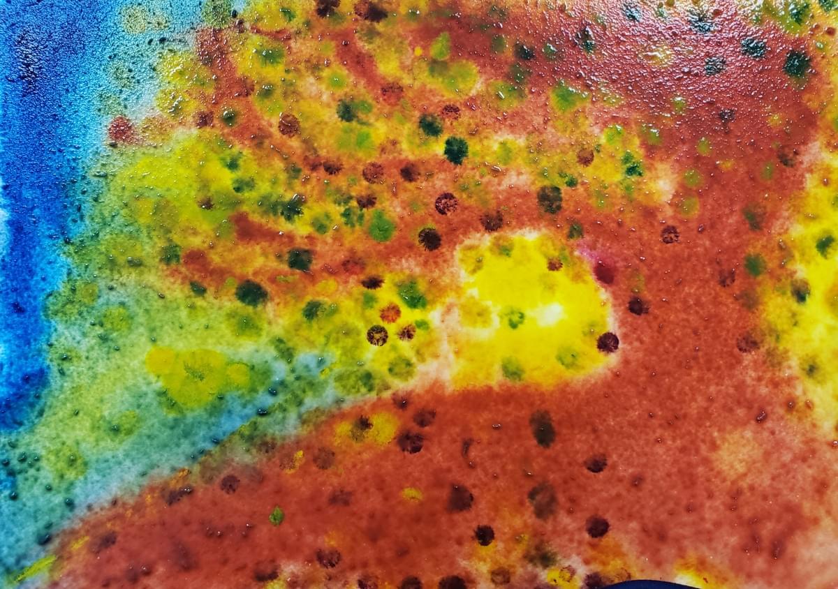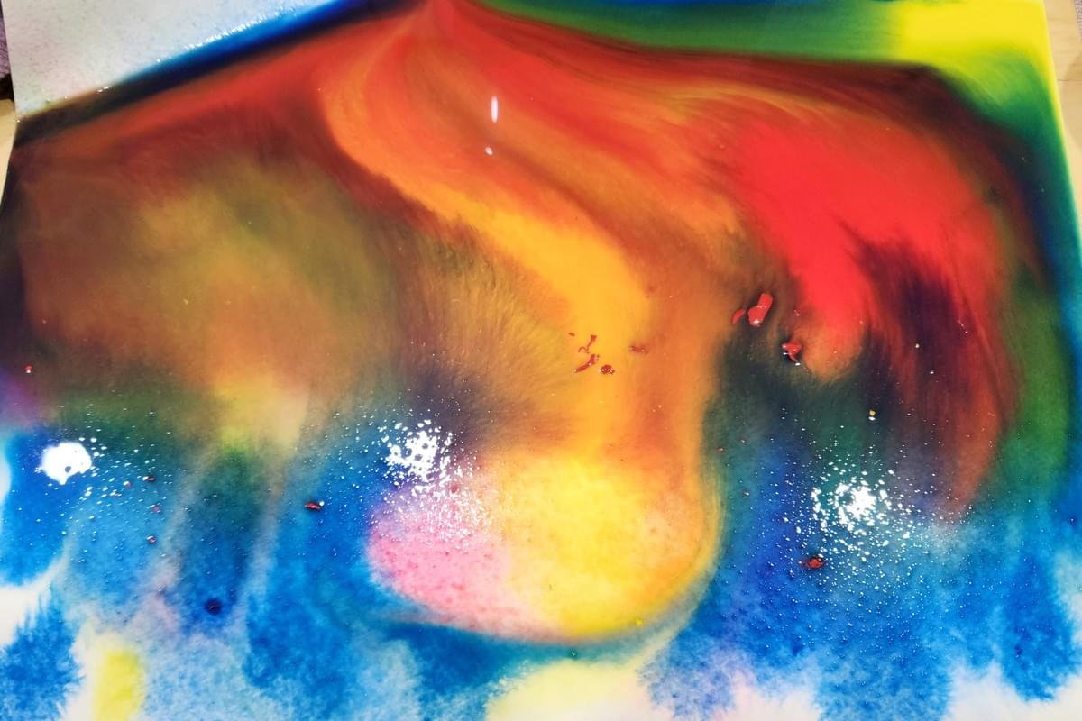 筆ではなく指で描いたりします。画用紙も水に浸したりします。